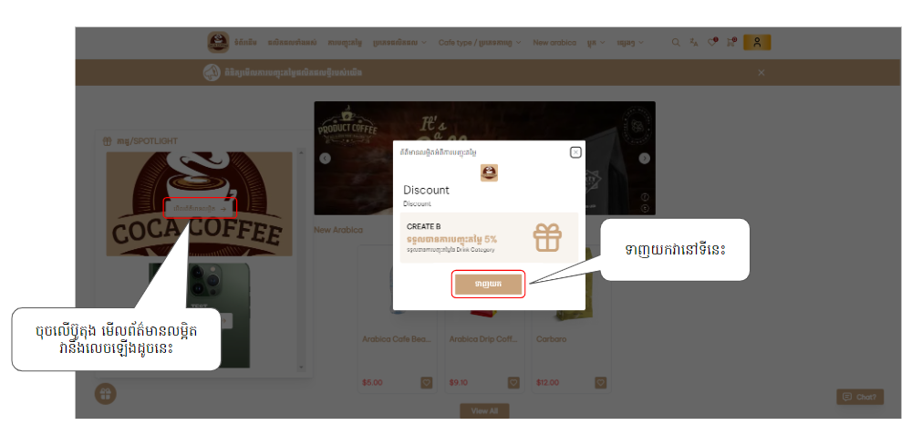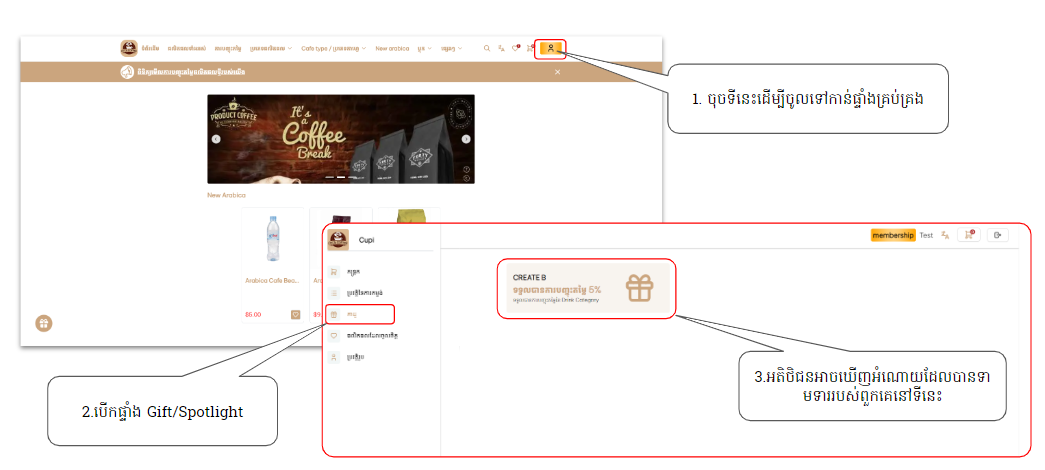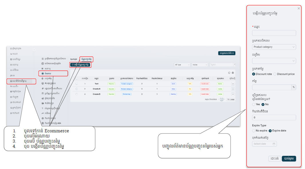 User Guide (BPAS ERP v3.4.23) Feature Sbcsolution គេហទំព័រពាណិជ្ជកម្ម អំណោយ (Gift / SpotLight) On this page អំណោយ ក្នុងប្រព័ន្ធអ្នកSBC BPAS៖ របៀបបង្កើតអំណោយរបស់យើង ជំហានទី១: បង្កើត Voucher ជំហានទី២: បង្កើត Spotlight ក្នុងគេហទំព័រពាណិជ្ជកម្មអេឡិចត្រូនិក៖ របៀបទទួលយកអំំណោយរបស់អ្នក: ជំហានទី 1: ចុចលើប៊ូតុងអំណោយ ជំហានទី 2: ទាញយកប័ណ្ណទូទាត់ ជំហានទី៣: មើលប័ណ្ណ