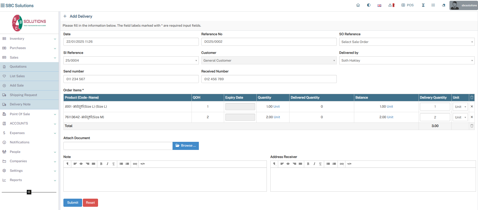 ជំហានទី4: បន្ទាប់ពីទទួលយកការបញ្ជាទិញហើយ លោកអ្នកបន្តចុចចូលទៅកាន់ពាក្យបានទទួលយកការបញ្ជាទិញពីអតិថិជន(Submit) រួចធ្វើការចុចសញ្ញាចុះក្រោមនិងបន្តចុចទៅកាន់ពាក្យ Delivery Note លោកអ្នកនឹងអាចផ្តល់ព័ត៌មានអំពីទំនិញរបស់អ្នកដែលមានមុខងារដូចជា៖
