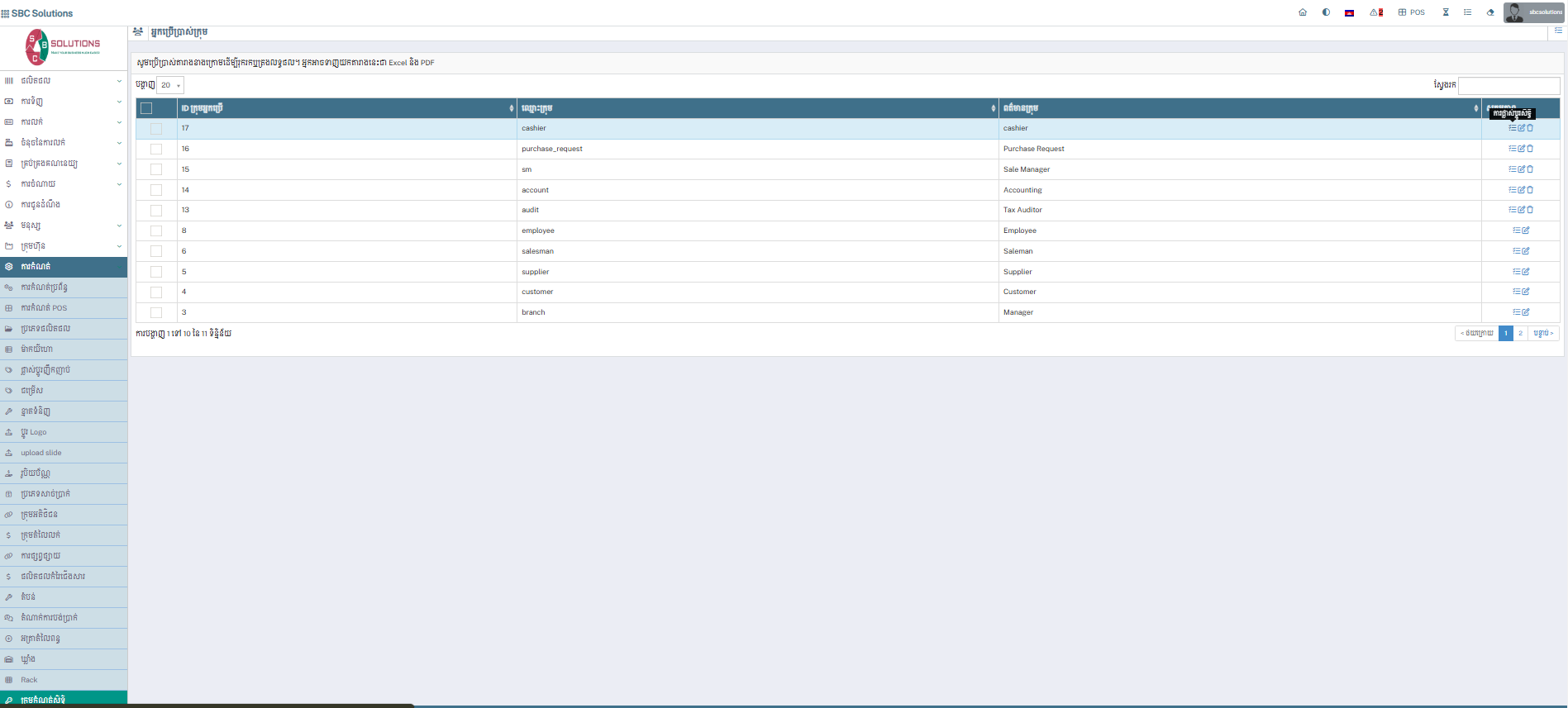 ក្រុមកំណត់សិទ្ធិ(Group Permissons) :ជាកន្លែងសម្រាប់ធ្វើការកំណត់មុខងារប្រើប្រាស់របស់អ្នកប្រើប្រាស់(User)ដែលមានមុខងារមួយចំនួនដូចជា៖ Default , Products , Purchases , Sales , Accounting , Permissions , Module Name , Finance , Suppliers , Report , Customer, Drivers, Miscellaneous.