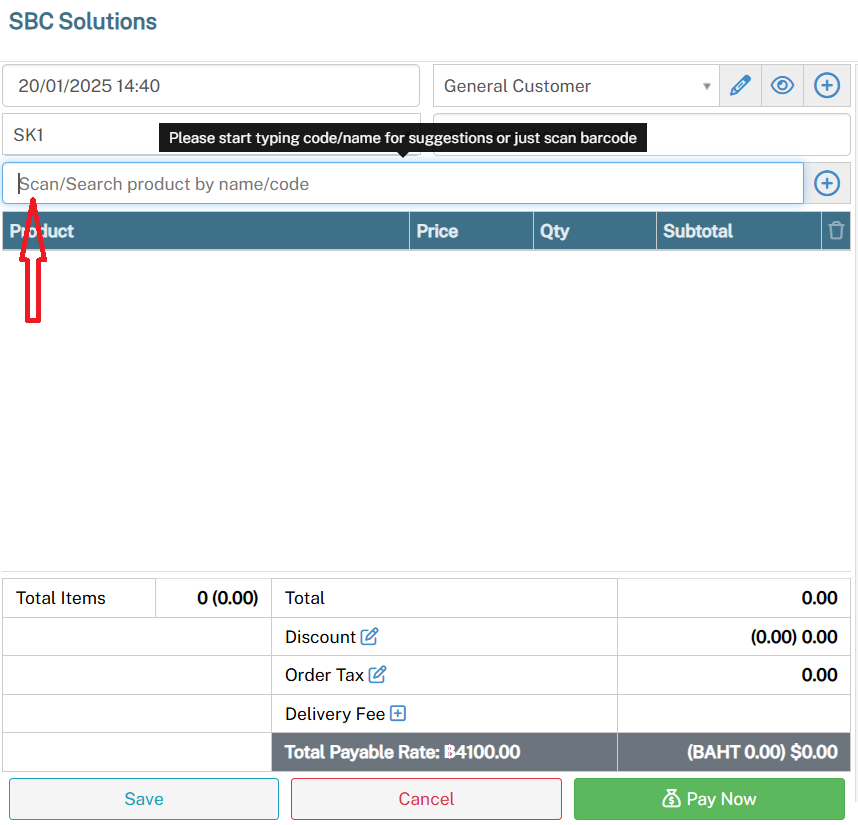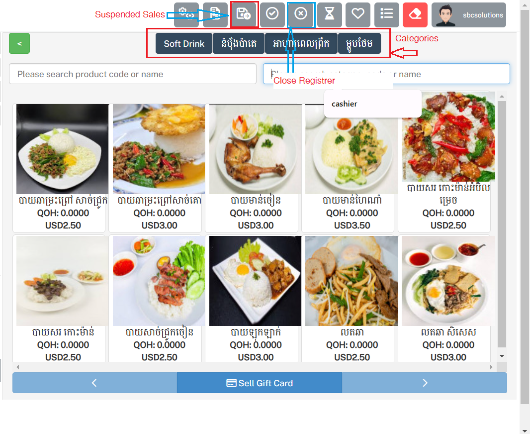 ឈ្មោះឬកូដផលិតផល(Product by name/code): ជាកន្លែងសម្រាប់ធ្វើការស្កែនឈ្មោះឬកូដផលិតផលឬធ្វើការវាយចូល
