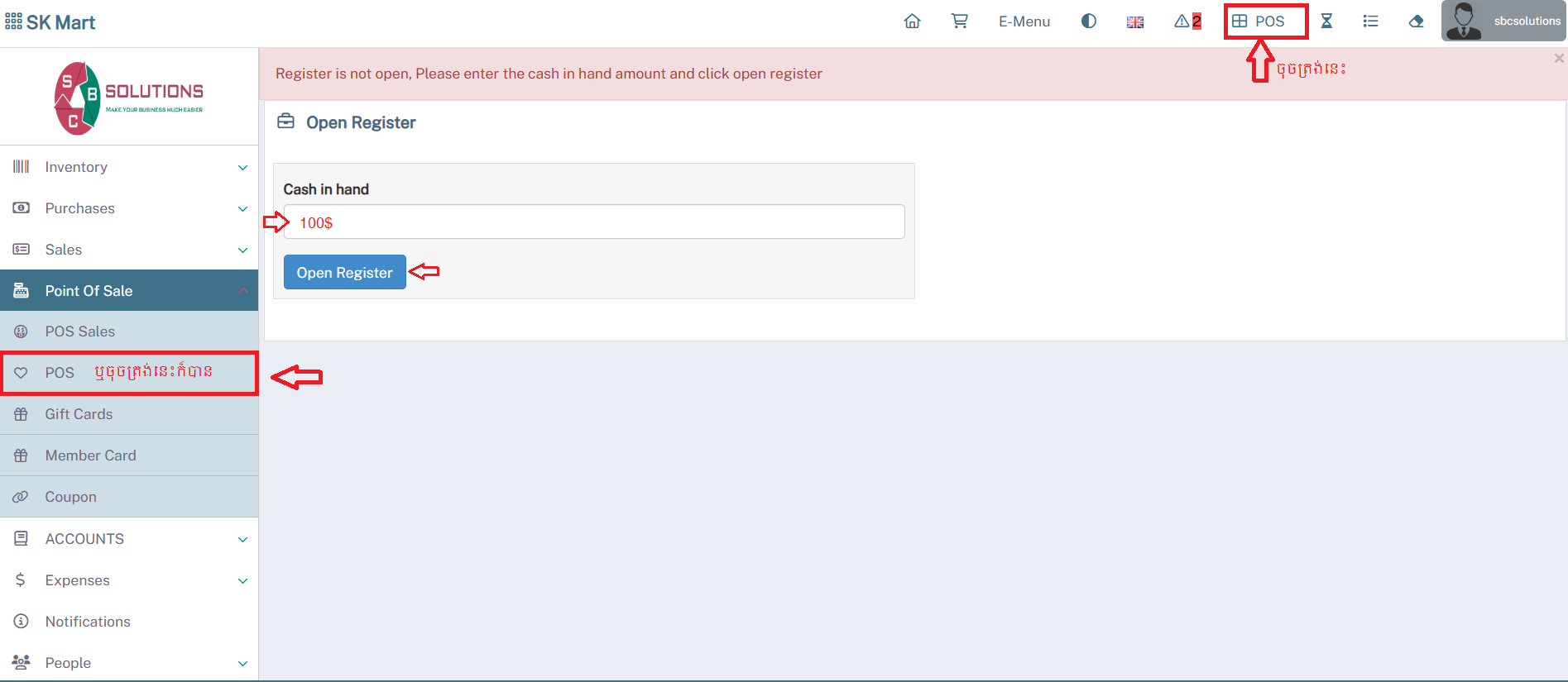 បើកចំនួនទឹកប្រាក់(Open Register)