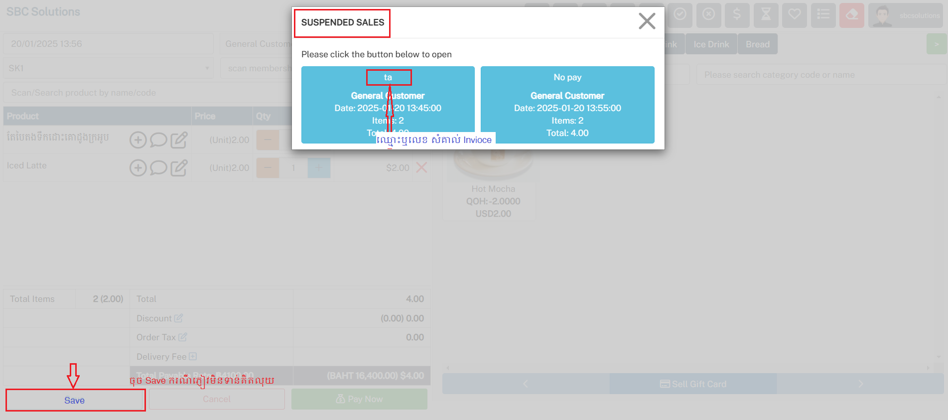ការលក់ដែលផ្អាក(Suspended Sales) : ជាកន្លែងសម្រាប់ធ្វើការរក្សាព័ត៌មានទំនិញអំពីអតិថិជនដែលពុំទាន់ធ្វើការបង់លុយរួច(ករណីនេះតម្រូវឱ្យអ្នកចុច Save ជាមុនសិន)