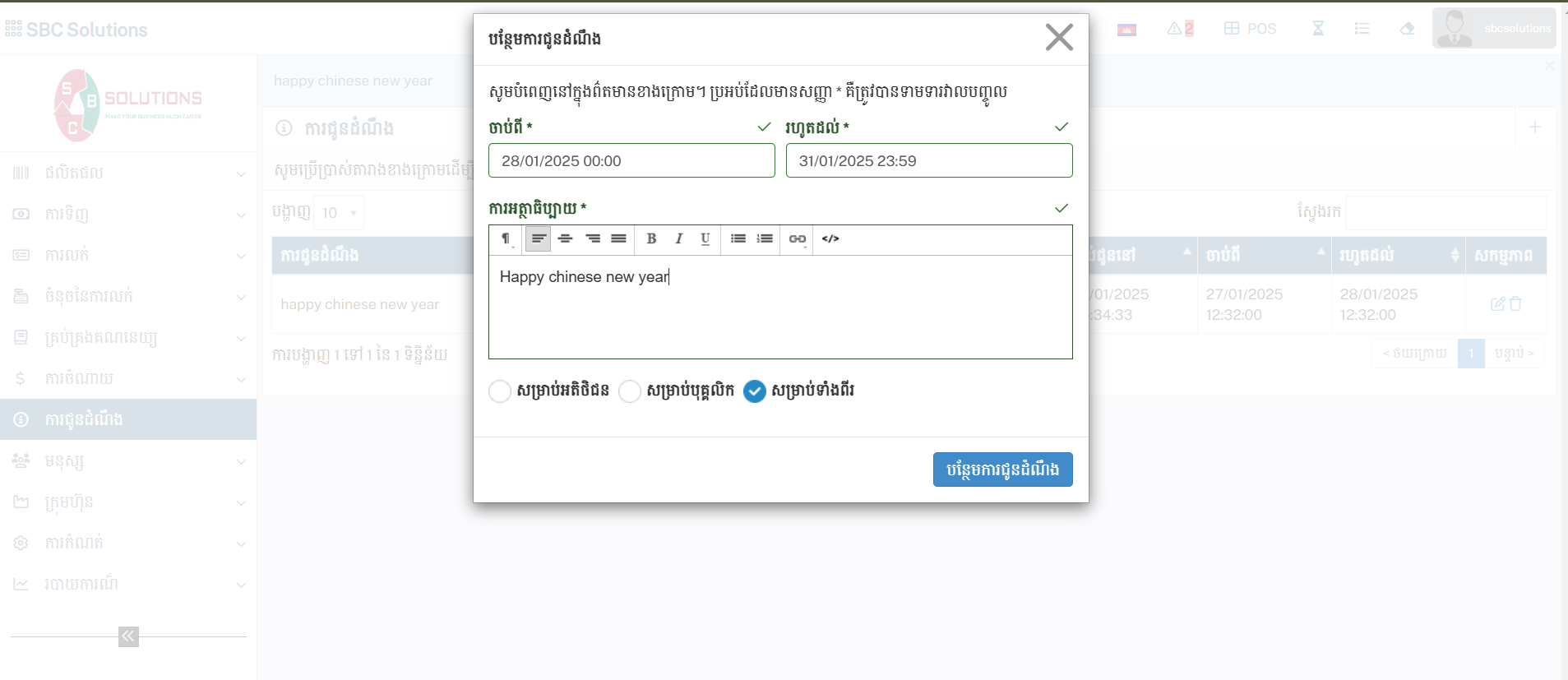 ការជូនដំណឺង ” រូចអ្នកអាចដាក់ថ្ងៃចាប់ផ្ដើម ថ្ងៃបញ្ចប់ និងការអត្ថាធិប្បាយ *