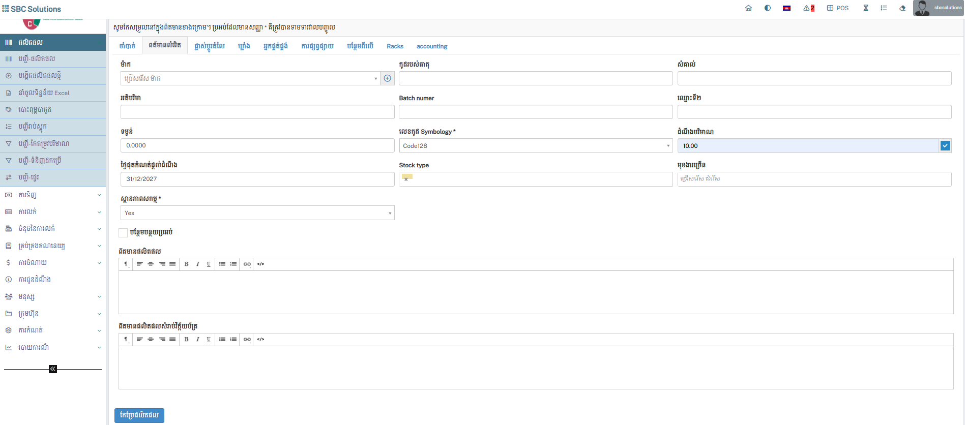 បន្ទាប់មកនៅខាងឆ្វេងមានកន្លែងដែលបង្ហាញផលិតផល ឈ្មោះផលិតផលដែលក្នុងនោះរូមមាន៖ រូបភាព កូដ ឈ្មោះ ប្រភេទ ប្រភេទក្រុមផលិតផល ខ្នាតក្នងការលក់ ផ្លៃដើម ថ្លៃលក់ បរិមាណ ការជូនដំណឺង និង ការបង្ហាញសកម្មភាព ដែលឱ្យអ្នកកែប្រែ បោះពុម្ពបាកូដ ឬលុប(ករីណនេះបើផលិតផលអ្នកធ្លាប់លក់មិនត្រូវលុបទេអាចឱ្យបាត់ទិន្និន័យរបស់អ្នក)។