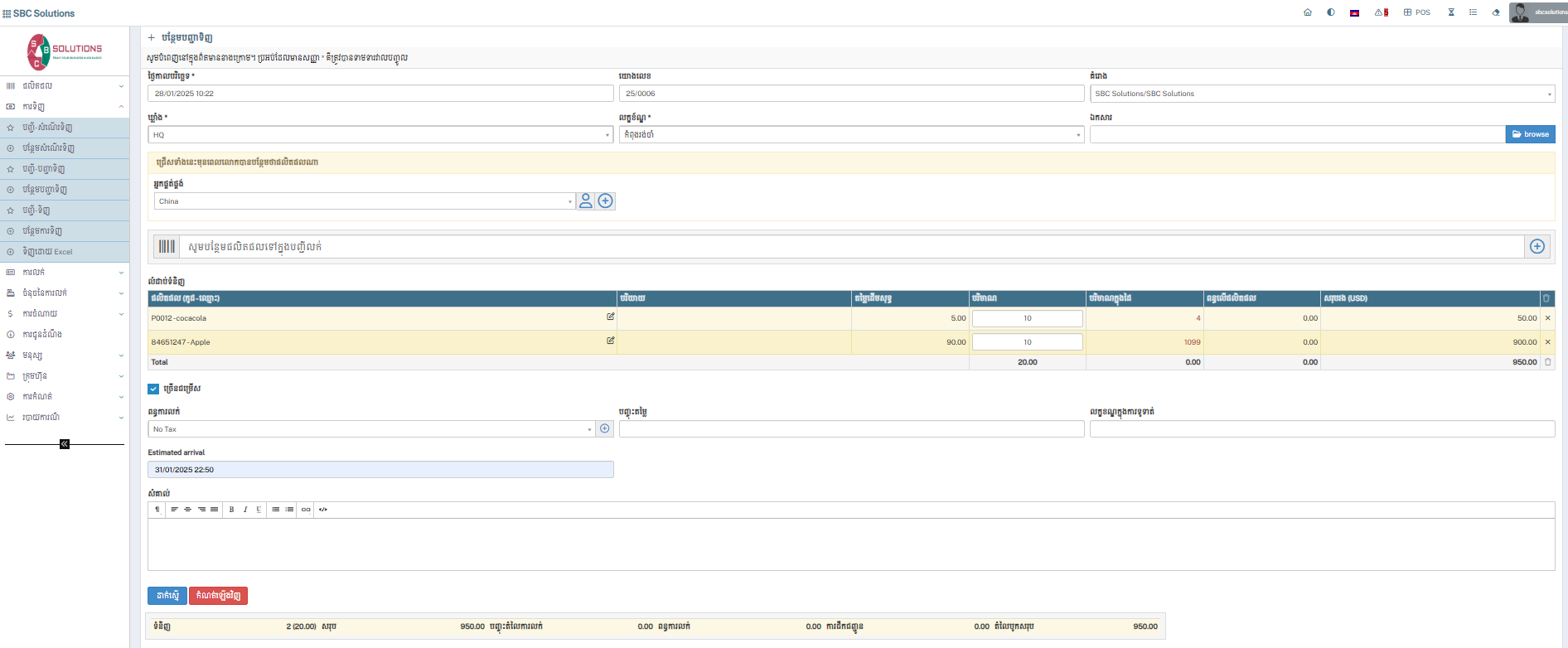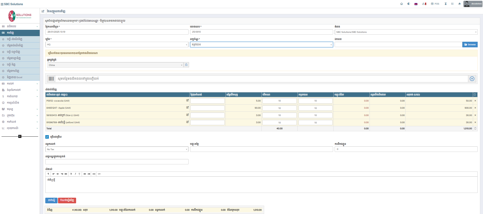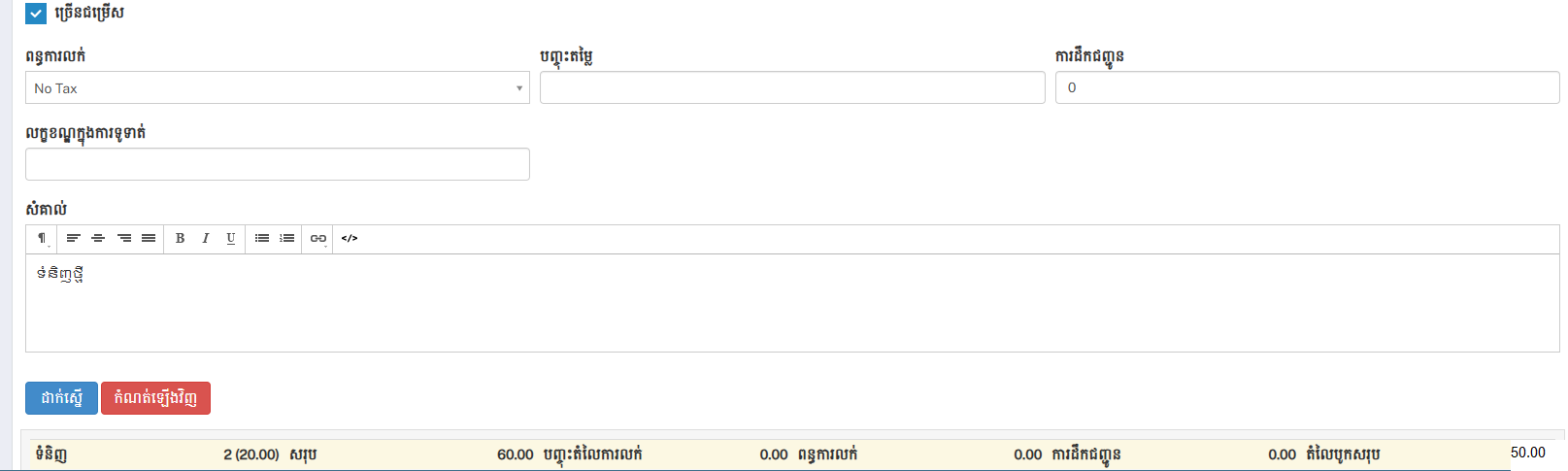 - ពន្ធការលក់ / Order Tax (Manaually) : ជាកន្លែងកំណត់ថ្លៃដឹកជញ្ជូន ។