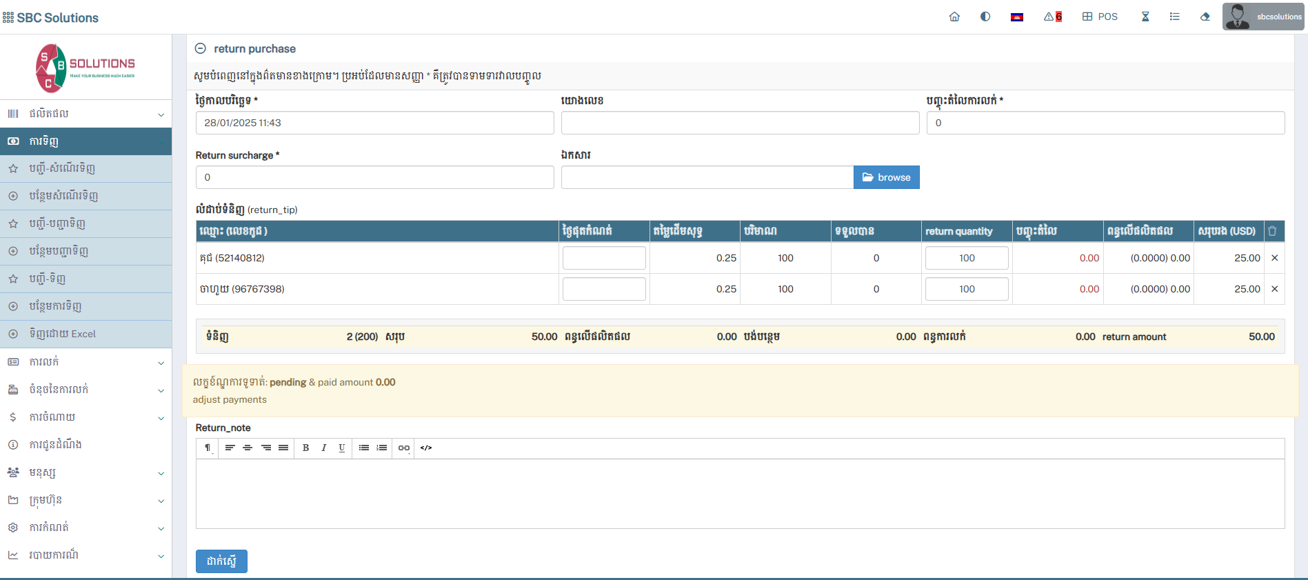 ការបញ្ជាទិញត្រឡប់មកវិញ / Return Purchase : ករណីអ្នកផ្ញើទំនិញទៅឱ្យ អ្នកផ្គត់ផ្គង់វិញ (បញ្ជាក់ទំនិញដែលបានបង់ប្រាក់មិនអាចផ្ញើវិញបានទេ)។