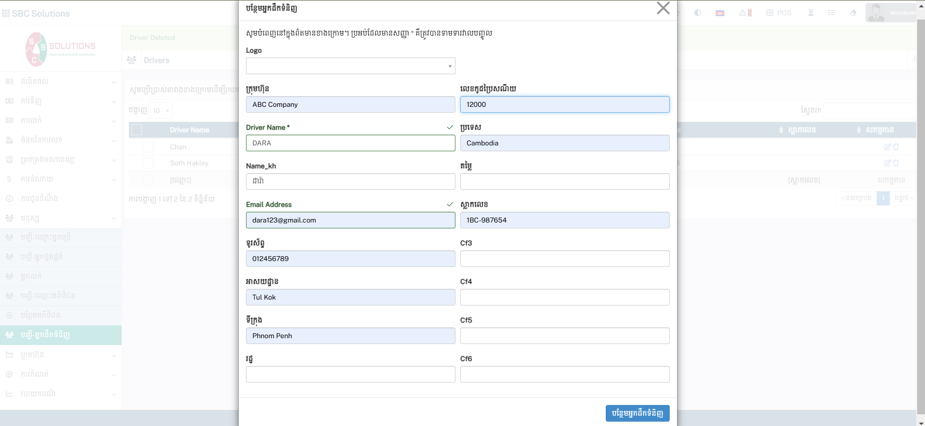 - បន្ទាប់មកលោកអ្នកបំពេញ ព័ត៌មានរបស់លោកអ្នកដឺកជញ្ជូន រួចលោកអ្នកចុច បន្ថែមអ្នកដឹកទំនិញ ជាការស្រេច