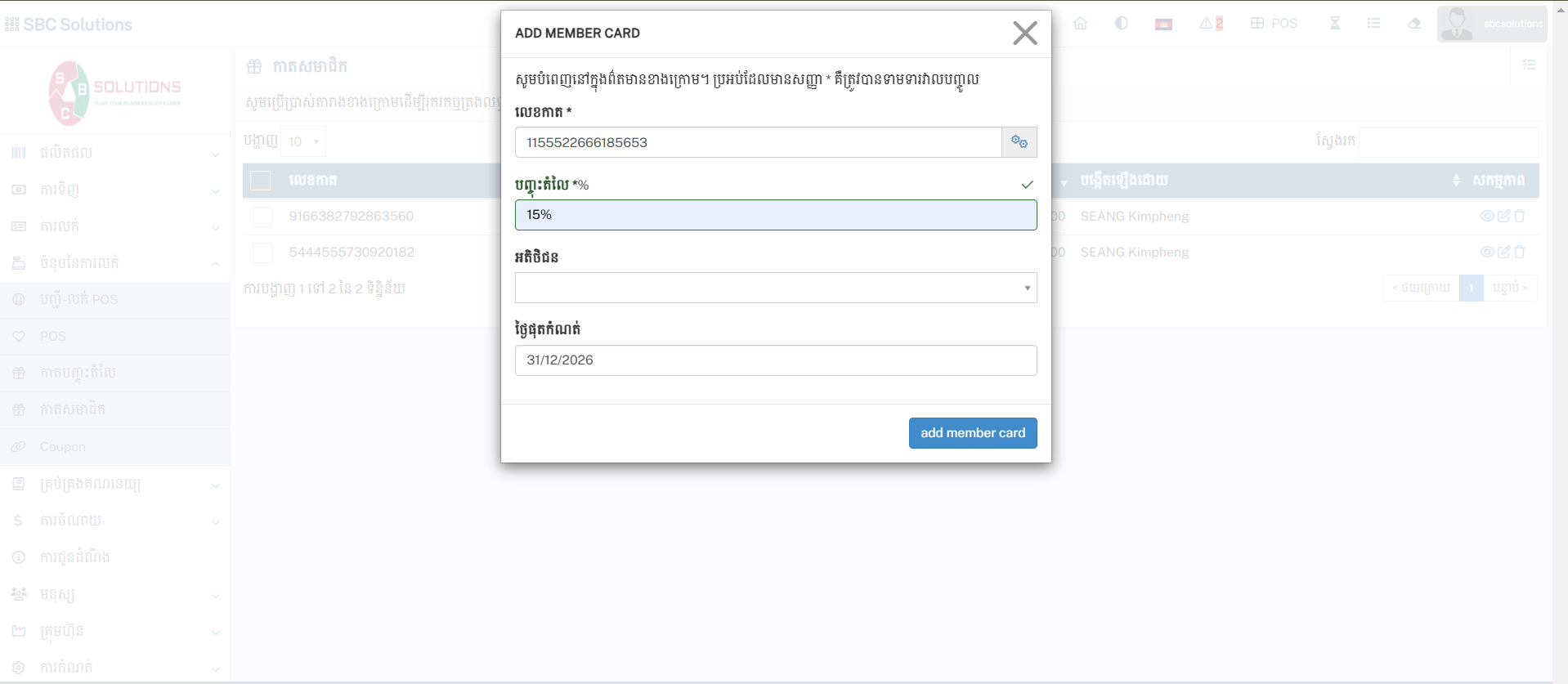 រួចអ្នកត្រូវបំពេញព័ត៌មានដូចជា៖ លេខកាត* បញ្ចុះតំលៃ*% និងថ្ងៃផុតកំណត់ នោះអ្នកនឹងទទួលបានកាតសមាជិកថ្មីមួយ(New Member Card) ដែលជាកាតសមជិករបស់អ្នក ដែលមានការបញ្ចុះតម្លៃទៅតាមអ្នកបានកំណត់។