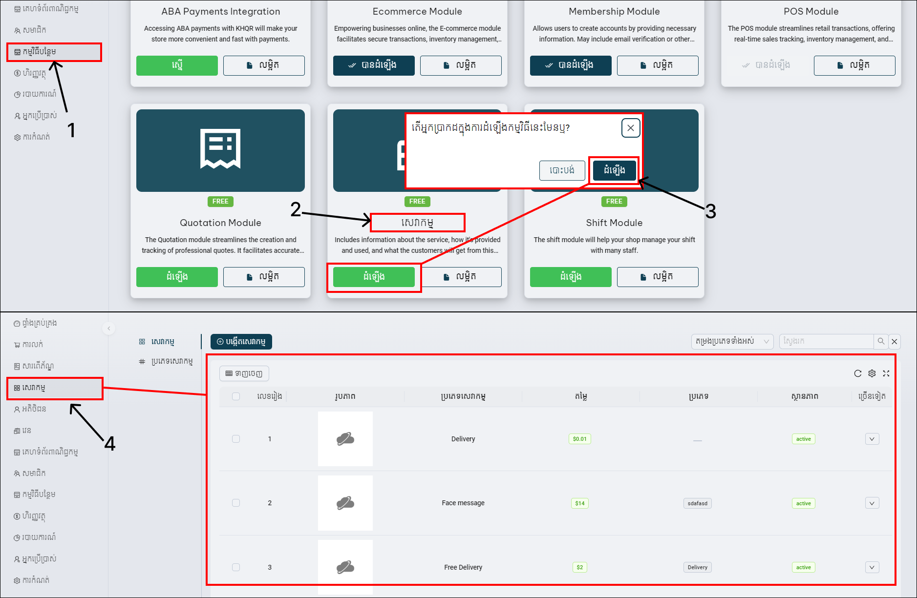 សេវាកម្ម (Service) : ជា Module ម្យ៉ាងសម្រាប់ហាង ដែលប្រើជាប្រភេទ សេវាកម្មជូនអតិថិជន នោះអ្នកក៏អាចប្រើកម្មវិធីនេះបានផងដែរ