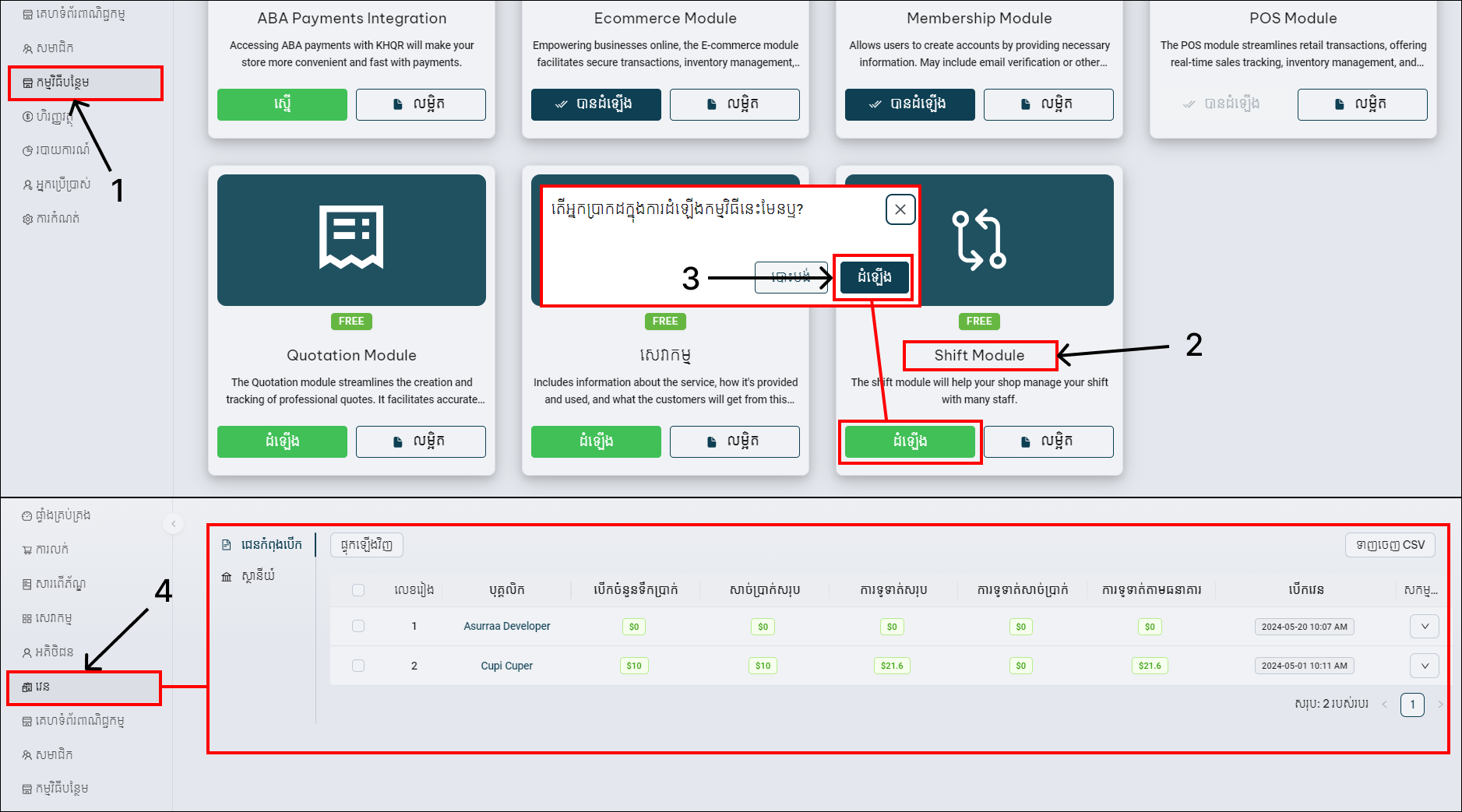 Shift Module : ប្រសិនបើហាងបស់លោកអ្នកមានបុគ្គលិកច្រើន ហើយអ្នកចង់ Control ទៅលើបុគ្គលិករបស់អ្នកអោយគាន់តែច្បាស់ និងដឹងពីវេនធ្វើការរបស់បុគ្គលិកអ្នក នោះអ្នកអាចធ្វើការដំឡើង Shift Module បាន