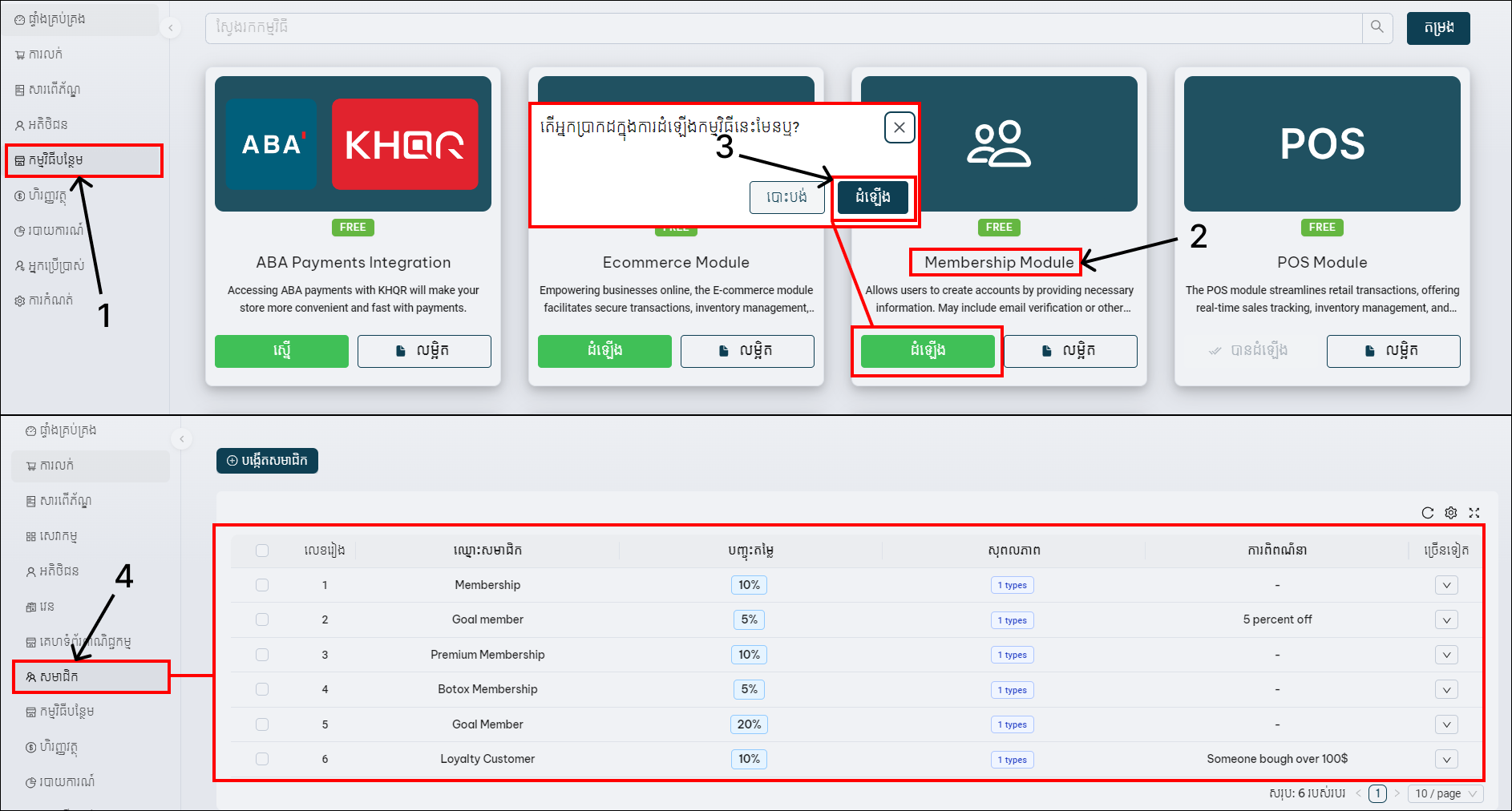 Membership Module : ជា Module មួយប្រភេទសម្រាប់អ្នកដែលមានហាងចង់លក់ជា Membership ទៅអោយអតិថិជន នោះអ្នកអាចប្រើ Membership Module បាន