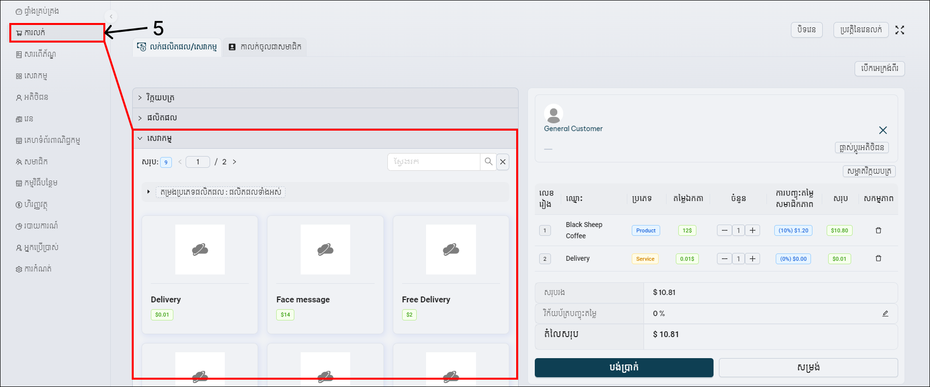 អ្នកក៏អាចលក់ជា សេវាកម្មបានទៀតផង ដោយអ្នកចូលទៅកាន់ ការលក់(POS/Sale) រួចហើយស្វែងរកពាក្យថា សេវាកម្ម (Service)