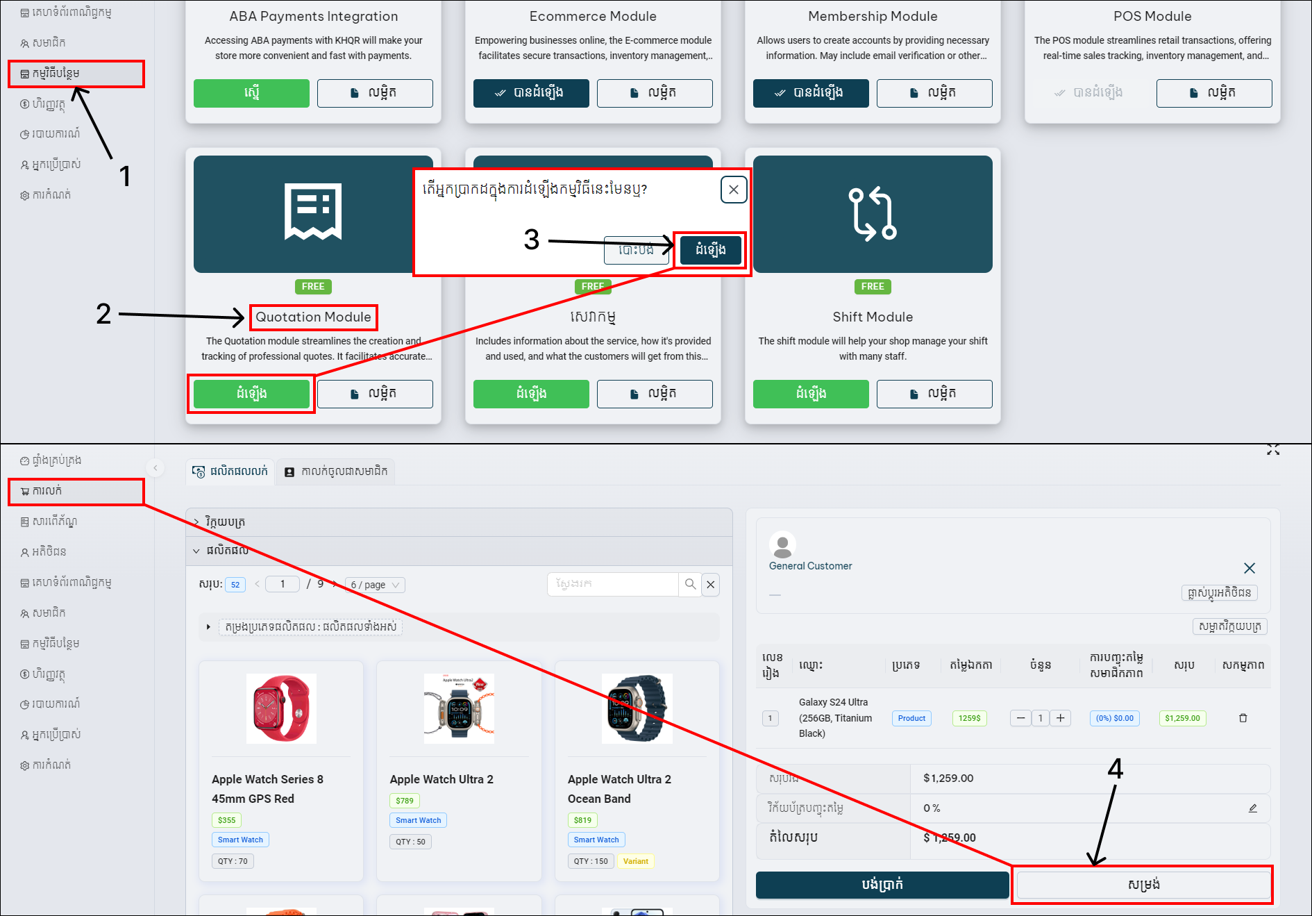 Quotation Module : ជា Module ដែលអាចចេញជាវិក្តយបត្រ័បាន ដោយមិនទាន់បង់ប្រាក់បាន (មានន័យថា : អតិថិជនគាត់មិនទាន់បានបង់ប្រាក់ ក៏ប៉ុន្តែគាត់ចង់បានជា វិក្តយបត្រ័របស់ផលិតផលដែលគាត់បានទិញនោះ)