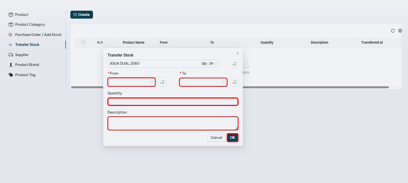 ជំហានទី៤: នៅក្នុងជ ំហាននេះអ្នកត្រូវបំពេញព័ត៌មានមួយចំនួនក្នុងការបំពេញការផ្ទេរស្តុករបស់លោកអ្នកដូចជា: ពី(From) ទៅ(To) បរិមាណ(Quantity) ការពិពណ៌នា(Description) ។