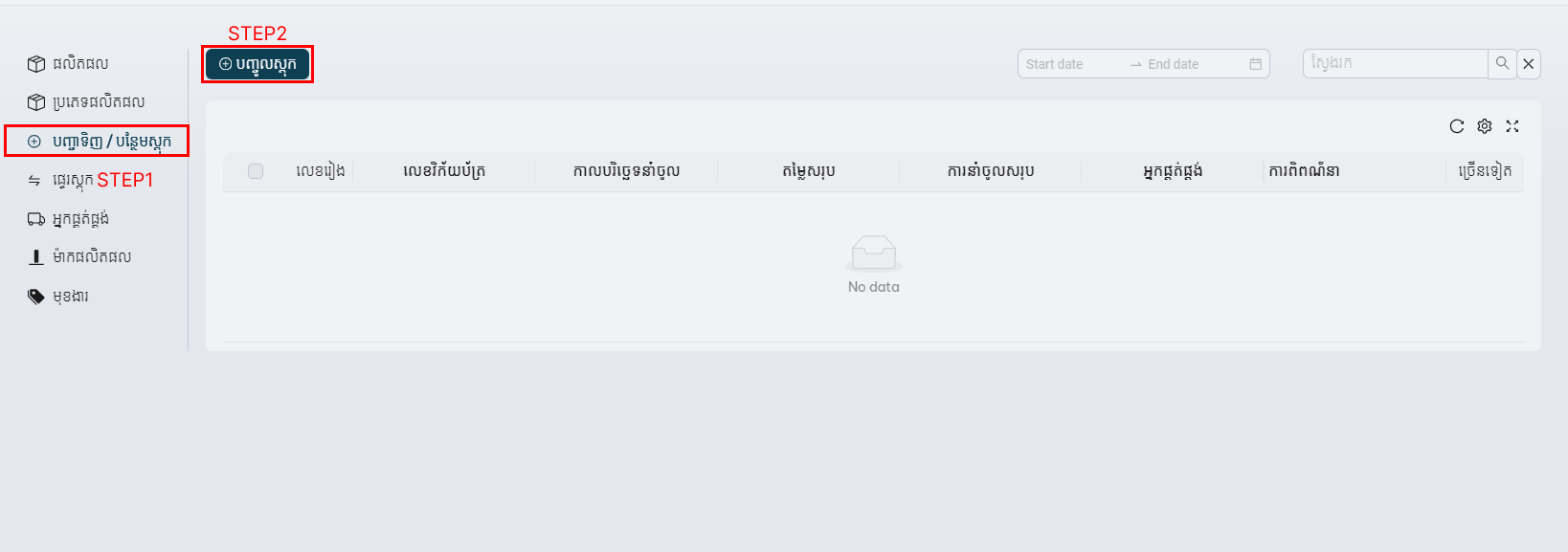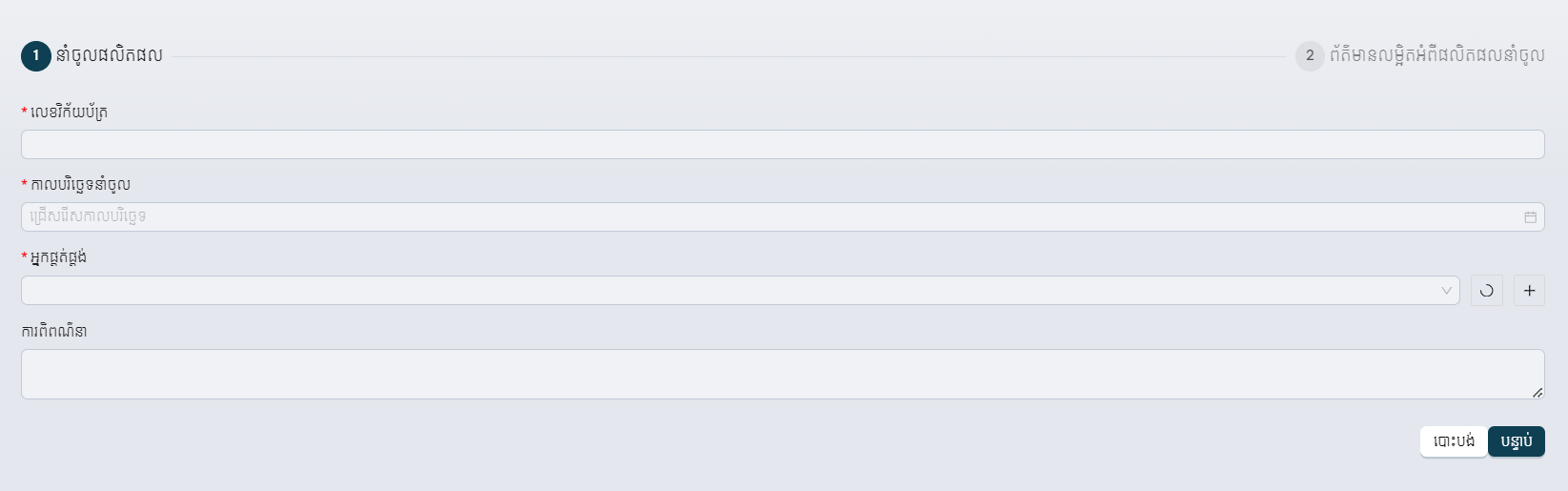 ការនាំចូលផលិតផល (Import Product): មាន លេខវិក័យប័ត្រ កាលបរិច្ឆេទនាំចូល អ្នកផ្គត់ផ្គង់ ការពិពណ៌នា