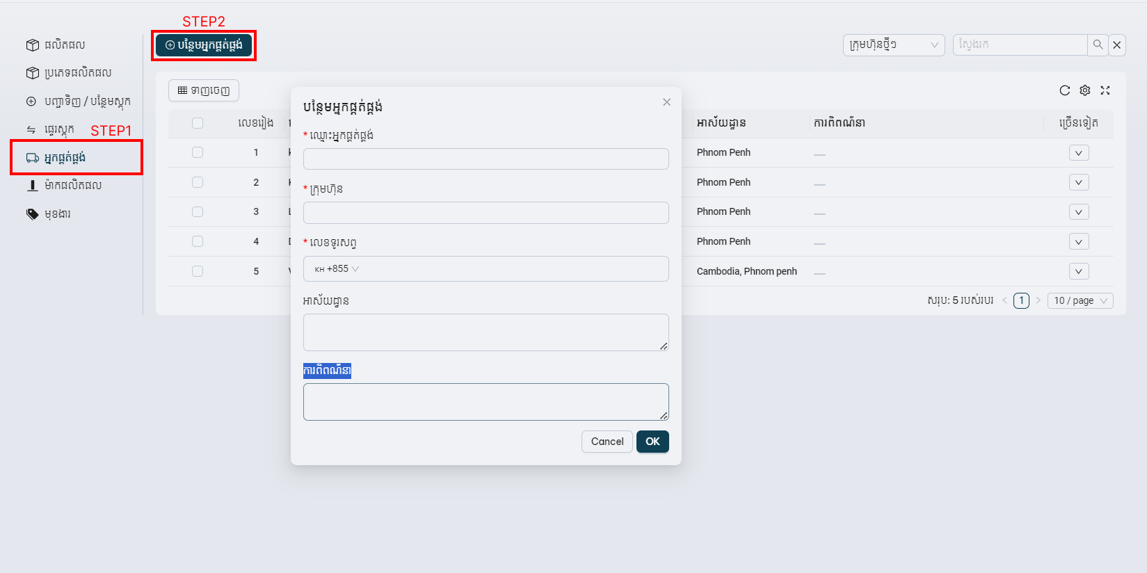 អ្នកផ្គត់ផ្គង់: ជាកន្លែងសម្រាប់លោកអ្នកជ្រើសរើសអ្នកផ្គត់ផ្គង់មួយណាដែលអ្នកបញ្ជាទិញទំនិញចូលស្តុក