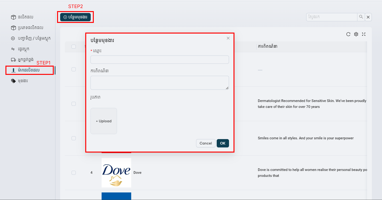 ជំហានទី២: លោកអ្នកបន្តចុចទៅកាន់ការបន្លែមមុខងារឬភាសាអង់គ្លេសថាAdd product Brand ជាបន្ទាប់លោកអ្នកត្រូវបំពេញព័ត៌មានដូចជា ឈ្មោះមុខងារ ការពិពណ៌នា និងអាចដាក់រូបភាពម៉ាកផលិតផល រួចចុចOKជាការស្រេច