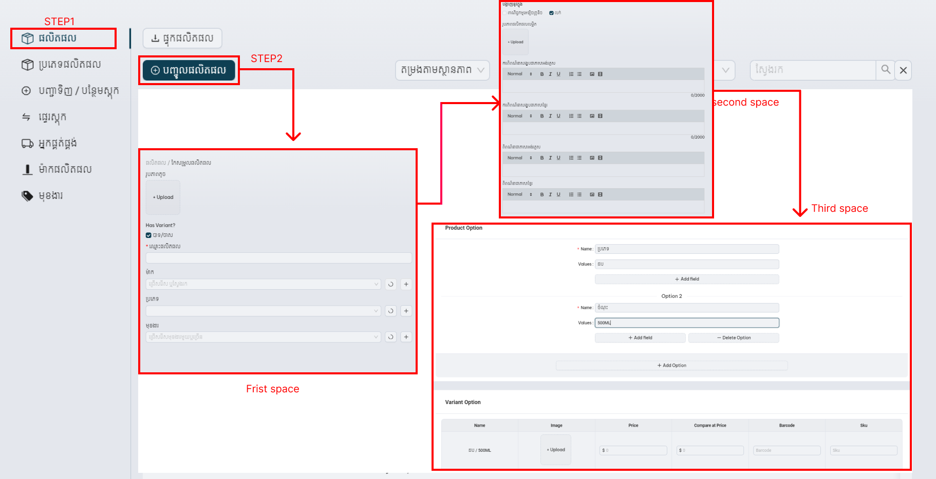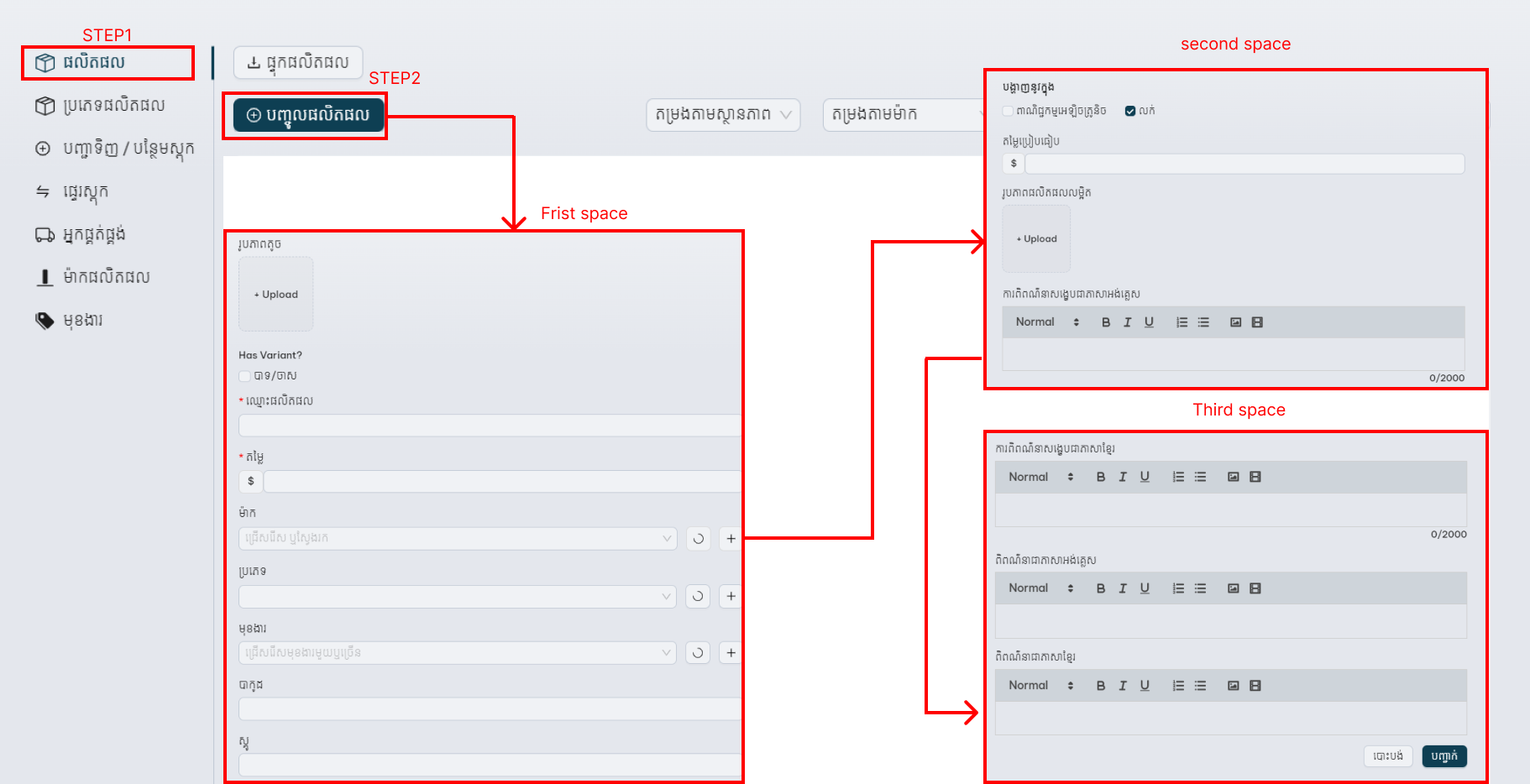 - ក្នុងជំហានទី១: លោកអ្នកអាចចុចទៅកាន់ការបង្កើតប្រភេទផលិតផល