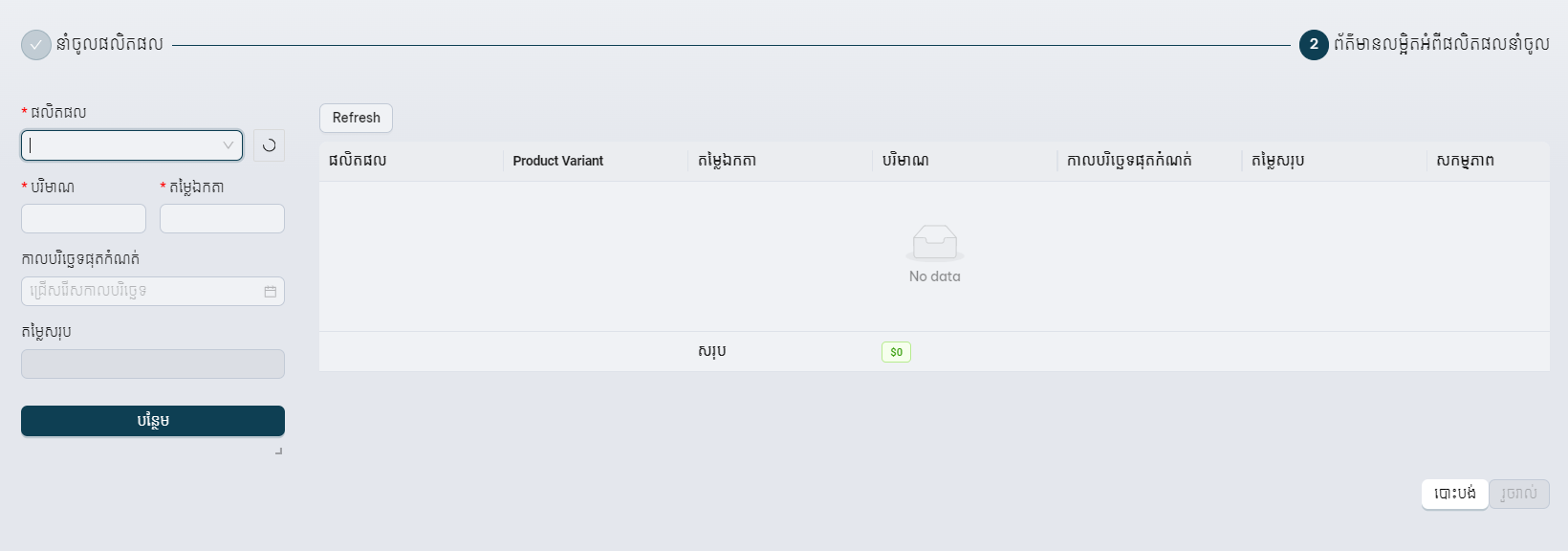 ព័ត៌មានលម្អិតអំពីផលិតផលនាំចូល**(Import Product Detail**): មាន ផលិតផល បរិមាណ តម្លៃឯកតា កាលបរិច្ឆេទផុតកំណត់ តម្លៃសរុប បន្ថែម