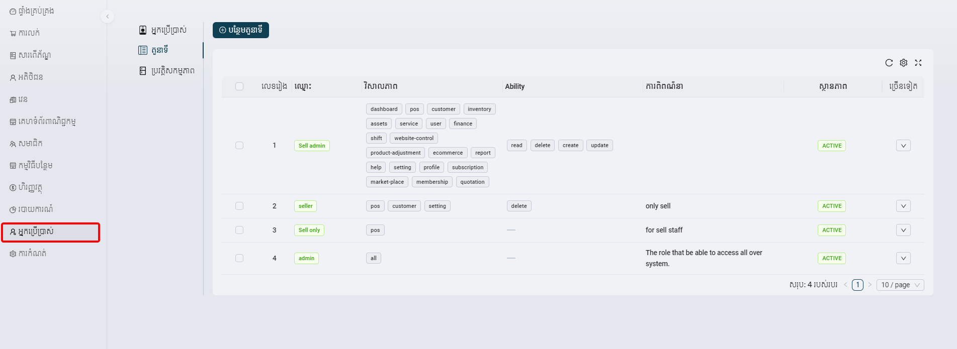 - តួនាទី(Roll): ជាកន្លែងសម្រាប់កំណត់តួនាទីឬមុខតំណែងរបស់អ្នកប្រើប្រាស់ក្នុងហាង