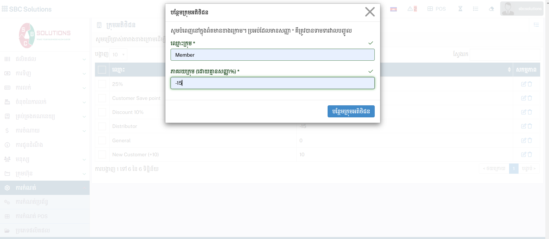 រួចបំពេញឈ្មោះក្រុមអតិថិជន និង ការបញ្ចុះតម្លៃ(បញ្ជាក់ត្រូវមានសញ្ញា - ពីមុខលេខ)