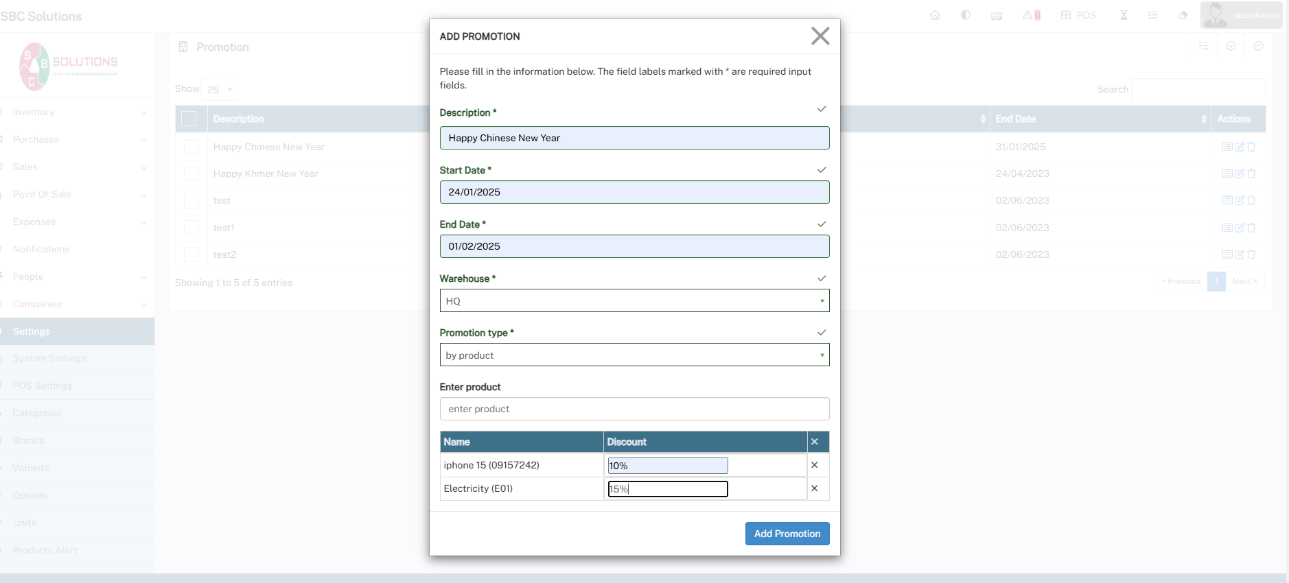 ជំហានទី៤ : នៅក្នងជំហានបន្ទាប់នេះតម្រូវអោយយើងបំពេញ បរិយាយ* ថ្ងៃចាប់ផ្តើម* ថ្ងៃបញ្ចប់* ឃ្លាំង* រូចជ្រើសរើសការបញ្ចុះតម្លៃ ប្រសិនបើយើងចង់បញ្ចុះតម្លៃទៅលើ ប្រភេទផលិតផល ឫ បញ្ចុះតម្លៃលើ ផលិតផល ។