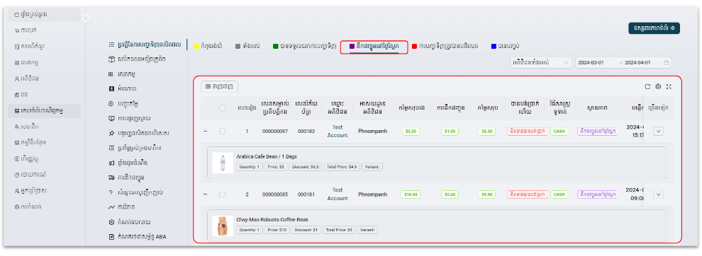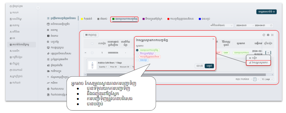 កំពុងរង់ចាំ(Pending): ជាទំនិញដែលម្ចាស់អាជីវកម្មពុំទាន់ទទួលបានការបញ្ជាទិញពីអតិថិជន