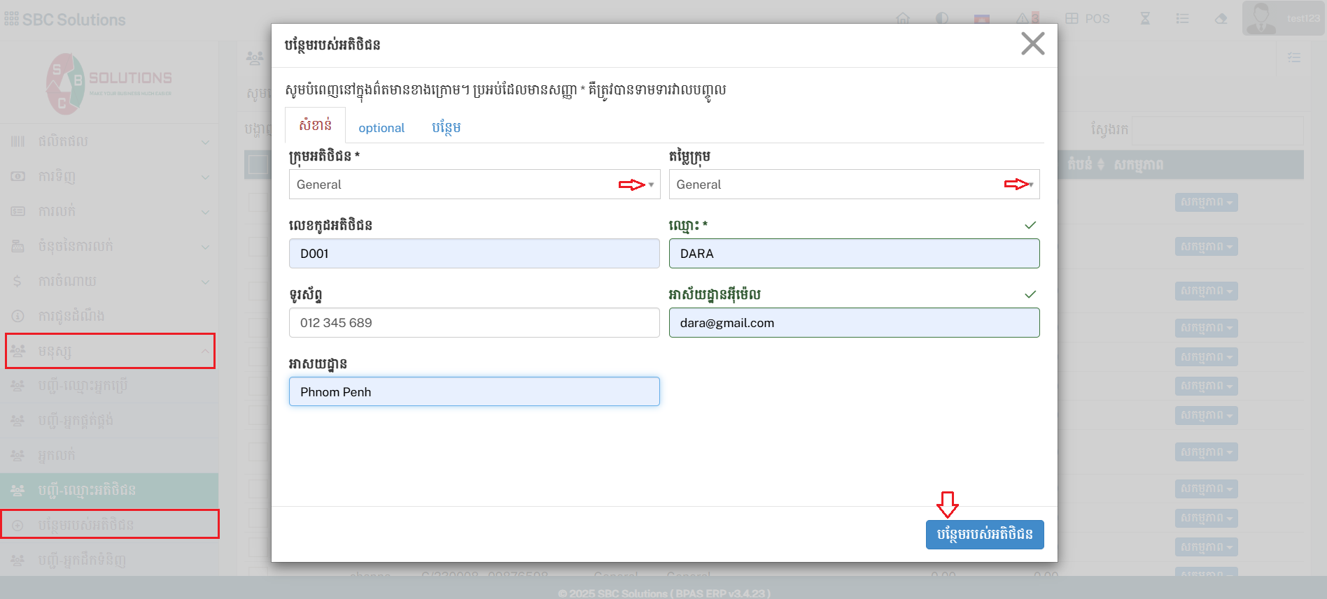 ក្នុងការចាប់ផ្តើមបង្កើតអតិថិជនដំបូងរបស់អ្នក តម្រូវអោយអ្នកចូលទៅកាន់ពាក្យ មនុស្ស (People) ជាកន្លែងបញ្ចូលអតិថិជន និងបន្ថែមប្រភេទអតិថិជនដើម្បីមានភាពងាយស្រួលទៅដល់ម្ចាស់អាជីវកម្មក្នុងការ SBC BPAS អតិថិជននិងទទួលបានព័ត៌មានមួយចំនួនដូចជាការចំណាយនិងប្រភេទផលិតផលដែលអតិថិជនបានជាវ។
