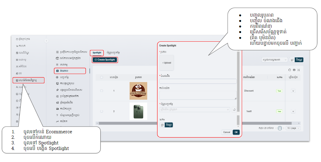 User Guide (BPAS ERP v3.4.23) Feature Sbcsolution គេហទំព័រពាណិជ្ជកម្ម អំណោយ (Gift / SpotLight) On this page អំណោយ ក្នុងប្រព័ន្ធអ្នកSBC BPAS៖ របៀបបង្កើតអំណោយរបស់យើង ជំហានទី១: បង្កើត Voucher ជំហានទី២: បង្កើត Spotlight ក្នុងគេហទំព័រពាណិជ្ជកម្មអេឡិចត្រូនិក៖ របៀបទទួលយកអំំណោយរបស់អ្នក: ជំហានទី 1: ចុចលើប៊ូតុងអំណោយ ជំហានទី 2: ទាញយកប័ណ្ណទូទាត់ ជំហានទី៣: មើលប័ណ្ណ