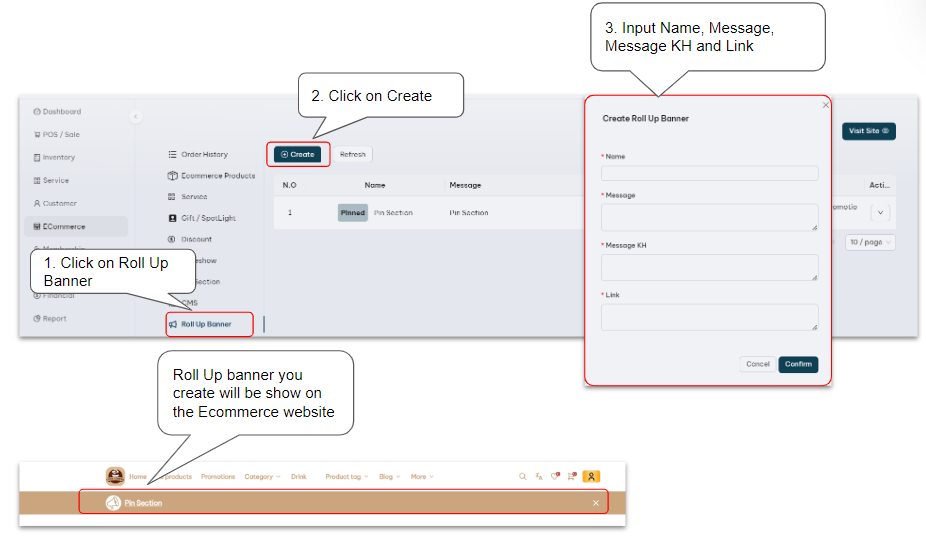 User Guide (BPAS ERP v3.4.23) Feature Sbcsolution គេហទំព័រពាណិជ្ជកម្ម ផ្ទាំង(Roll Up Banner) On this page ផ្ទាំង(Roll Up Banner) Roll Up Banner៖ កន្លែងសម្រាប់បង្ហាញ