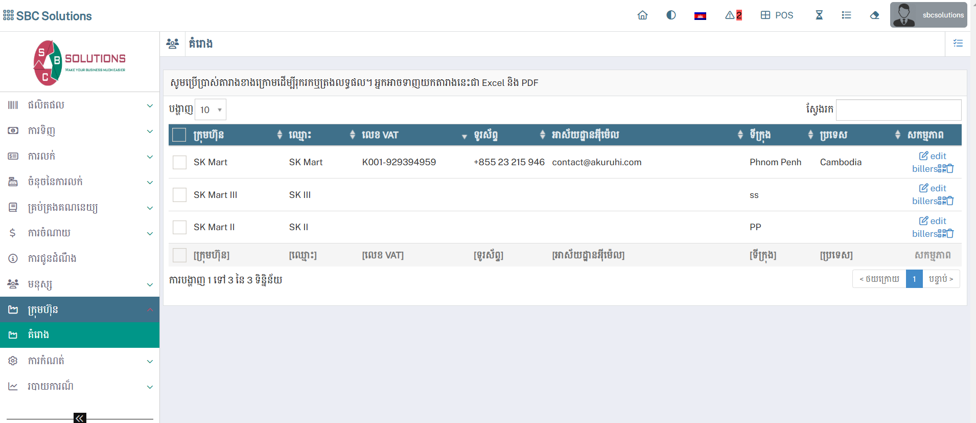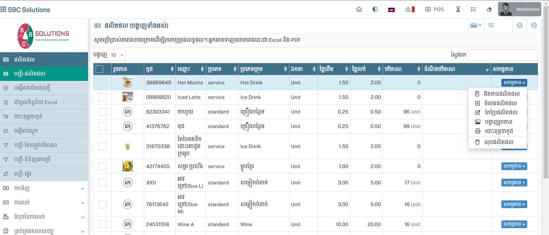 ការបង្ហាញសកម្មភាព ដែលឱ្យអ្នកកែប្រែ បោះពុម្ពបាកូដ ឬលុប(ករីណនេះបើផលិតផលអ្នកធ្លាប់លក់មិនត្រូវលុបទេអាចឱ្យបាត់ទិន្និន័យរបស់អ្នក)។