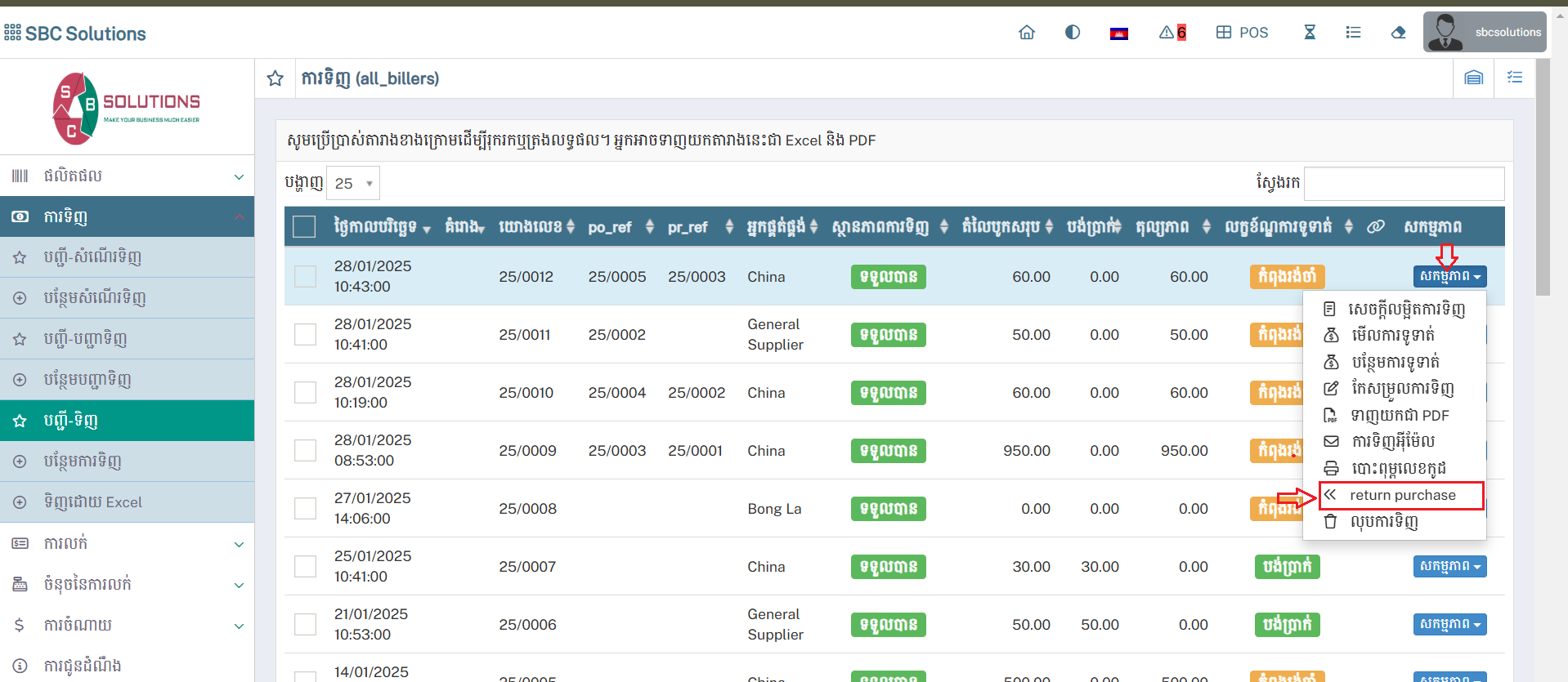 ការបញ្ជាទិញត្រឡប់មកវិញ / Return Purchase : ករណីអ្នកផ្ញើទំនិញទៅឱ្យ អ្នកផ្គត់ផ្គង់វិញ (បញ្ជាក់ទំនិញដែលបានបង់ប្រាក់មិនអាចផ្ញើវិញបានទេ)។