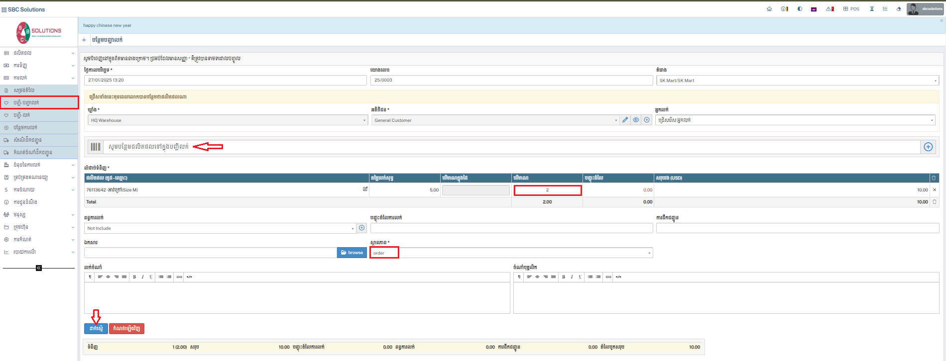 រួចធ្វើការបំពេញព័ត៌មានឈ្មោះអតិថិជន និង ចំនួនផលិតផល៖