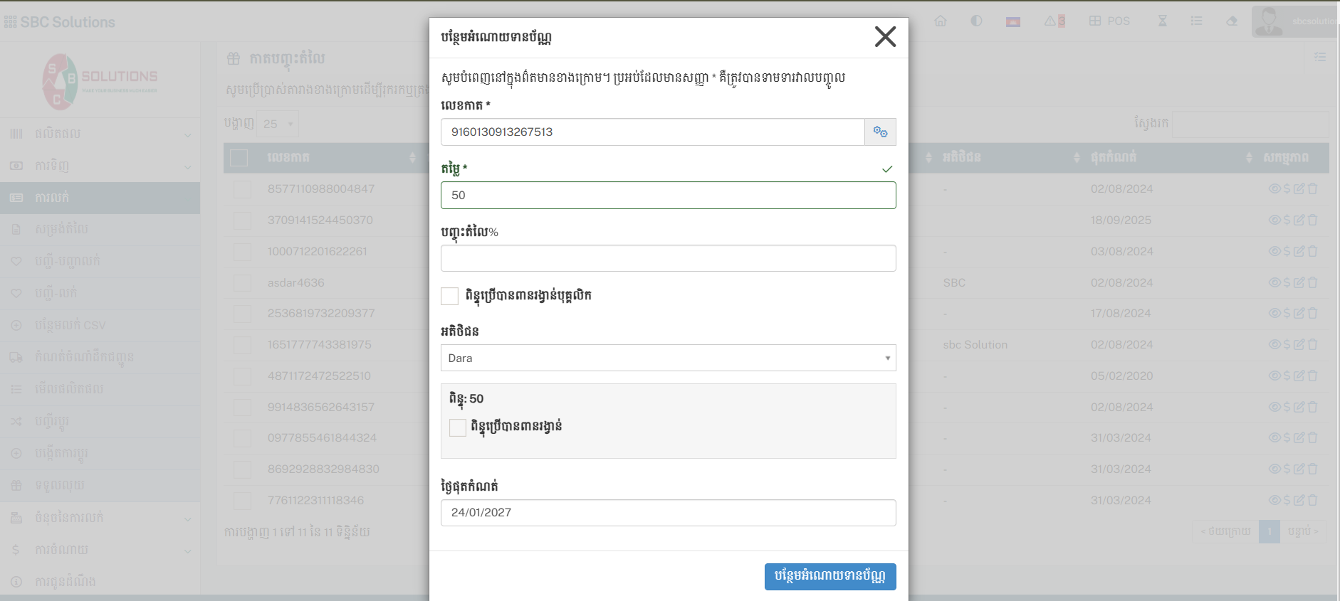 រួចអ្នកត្រូវបំពេញព័ត៌មានដូចជា៖ លេខកាត* បញ្ចុះតំលៃ*% និងថ្ងៃផុតកំណត់ នោះអ្នកនឹងទទួលបានកាតសមាជិកថ្មីមួយ(New Member Card) ដែលជាកាតសមជិករបស់អ្នក ដែលមានការបញ្ចុះតម្លៃទៅតាមអ្នកបានកំណត់។