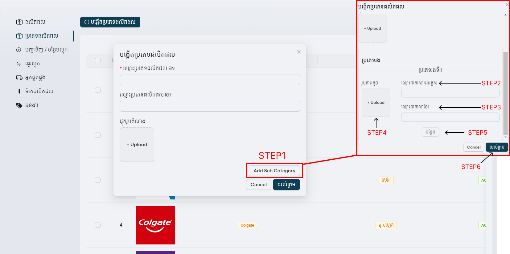 ជំហានទី៥: ក្នុងករណីលោកអ្នកចង់ធ្វើការបន្លែមប្រភេទរងឬSub Category អ្នកអាចចុចពាក្យបន្លែមដើម្បីបន្លែមប្រភេទរងឬ Add Sub Category