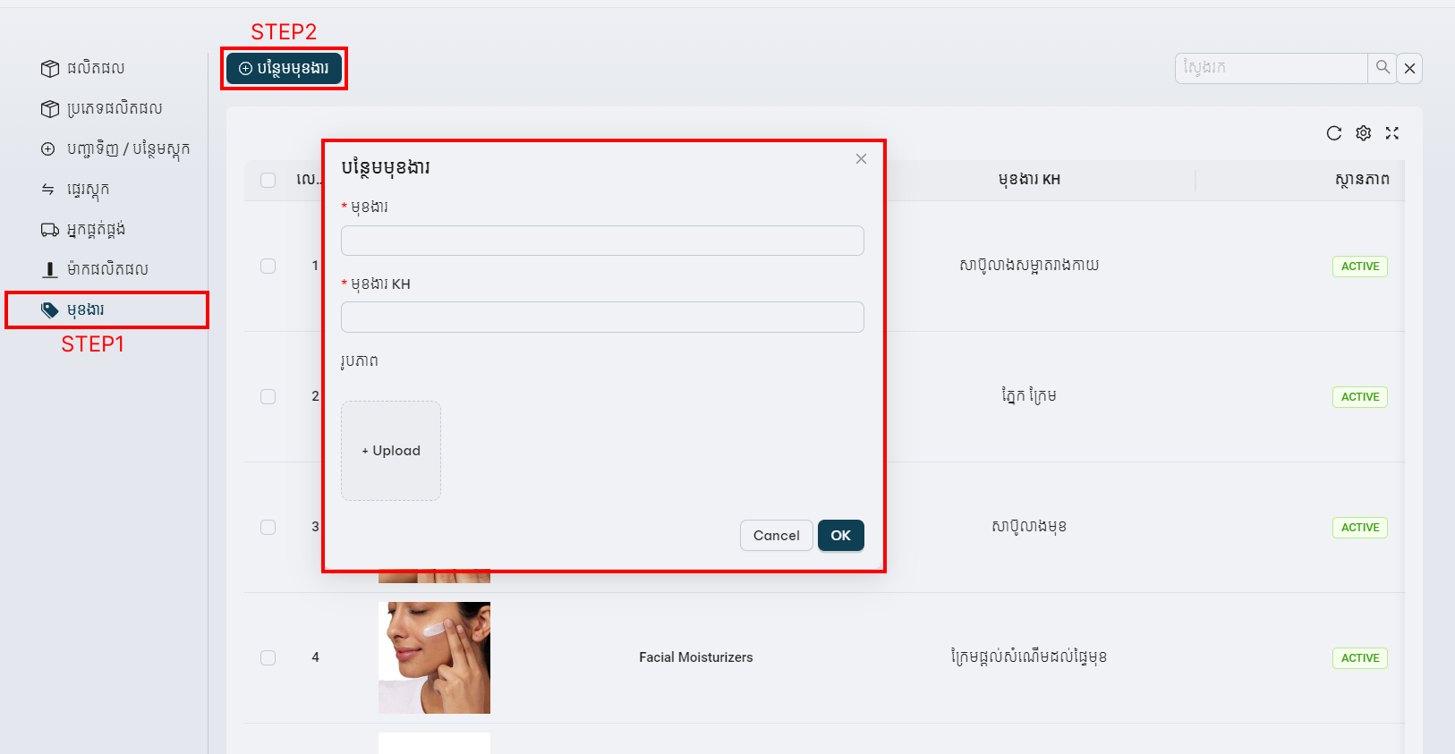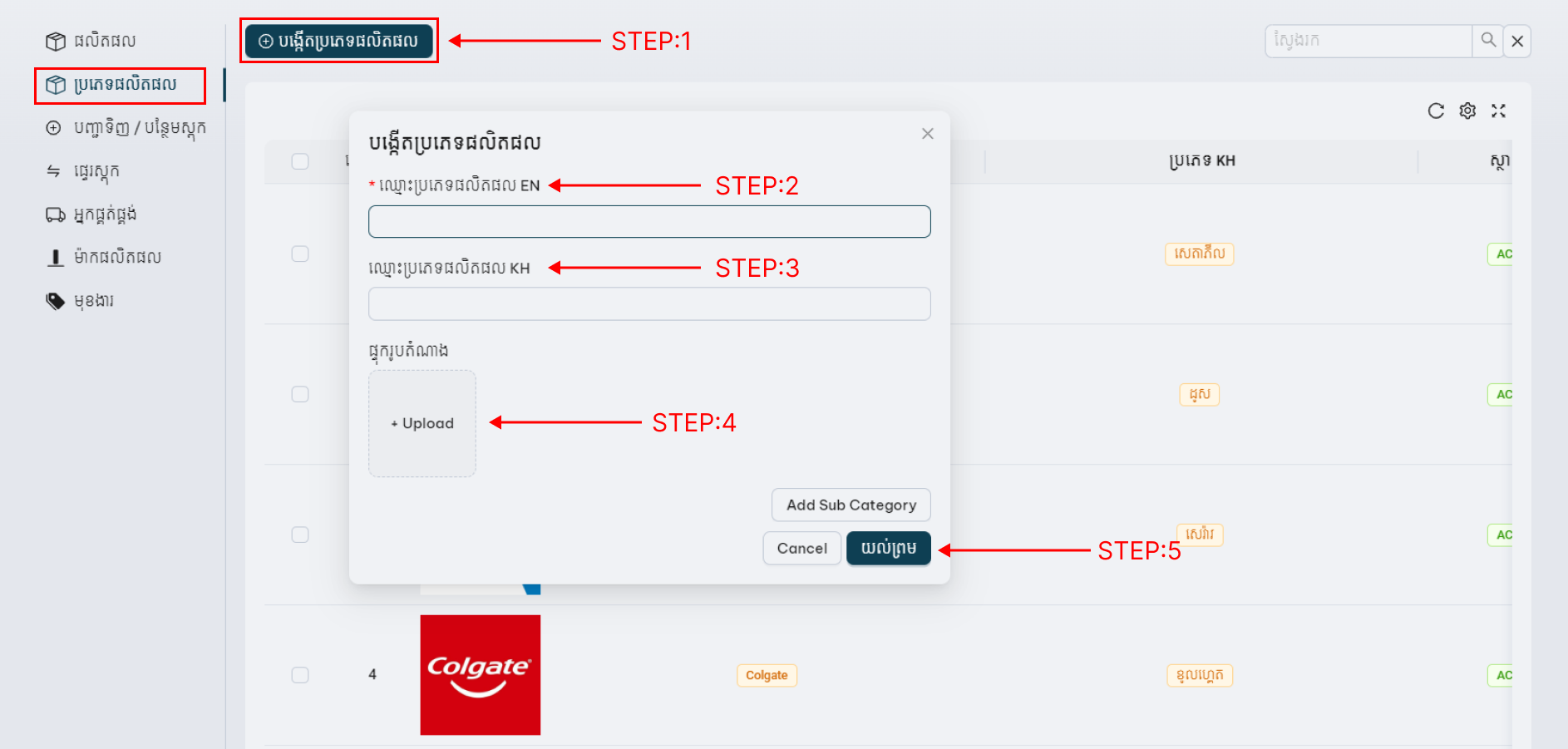 - ក្នុងជំហានទី១: លោកអ្នកអាចចុចទៅកាន់ការបង្កើតប្រភេទផលិតផល