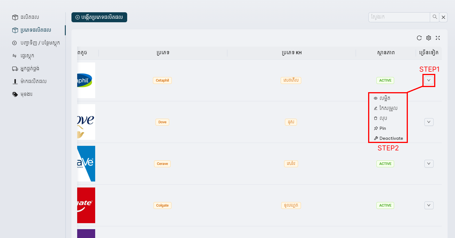 Deactivate: ជាមុខងារដែលលោកអ្នកអាចធ្វើការបិទឬបើកប្រភេទផលិតផលមិនឲអតិថិជនឃើញនៅក្នុងកន្លែងលក់ (POS) និង គេហទំព័រEcommerce