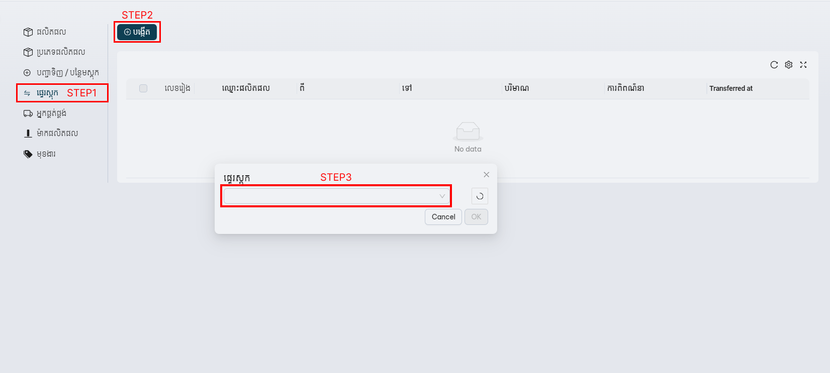 ជំហានទី១: លោកអ្នកតម្រូវអោយចុចទៅកាន់ពាក្យផ្ទេរស្តុក(Transfer Stock)