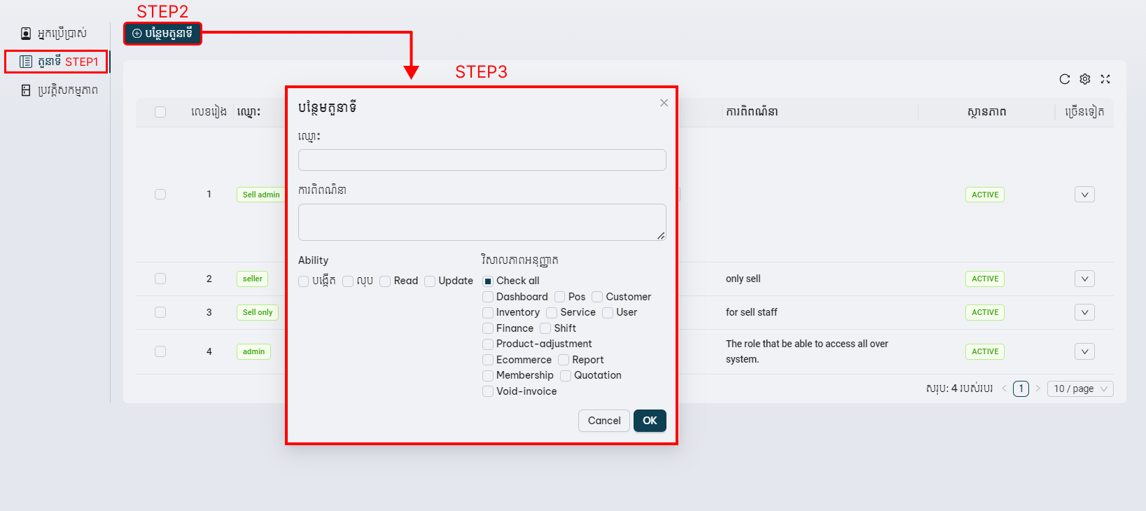 - តួនាទី(Roll): ជាកន្លែងសម្រាប់កំណត់តួនាទីឬមុខតំណែងរបស់អ្នកប្រើប្រាស់ក្នុងហាង
