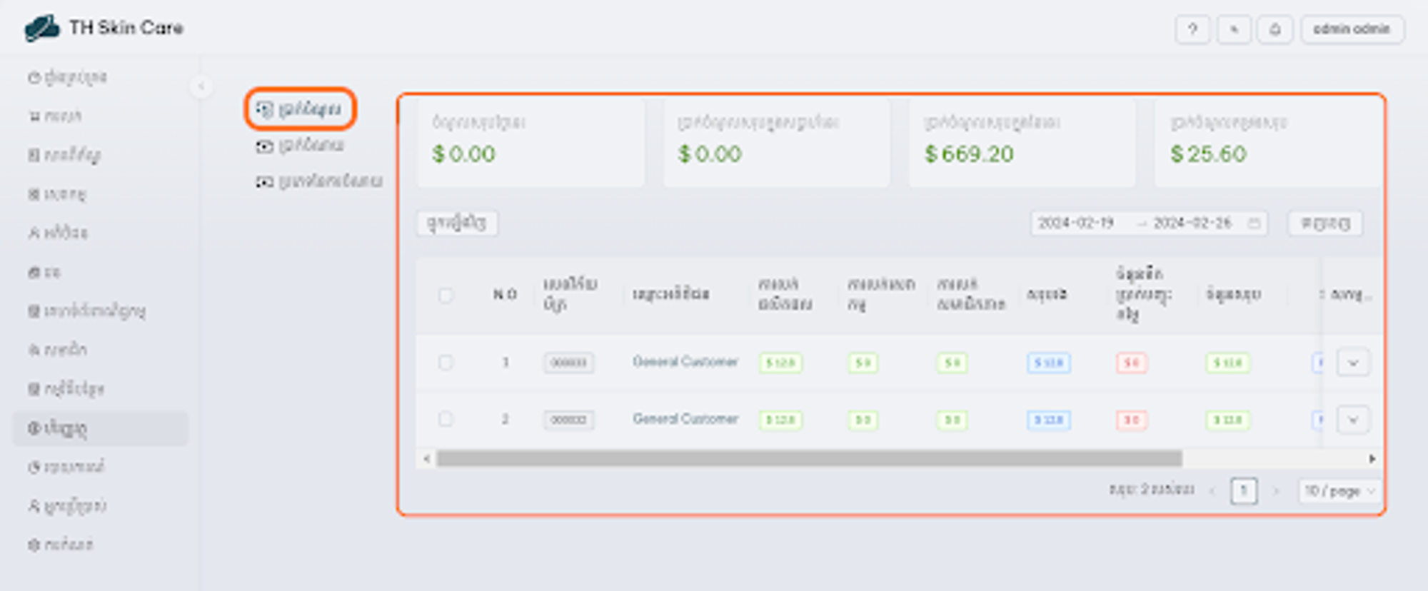 ជាកន្លែងបង្ហាញ ចំនួនចំណូលសរុបប្រចាំ( ថ្ងៃ, សប្ដាហ៍, និងខែ)