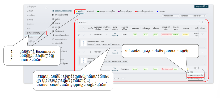 ប្រវត្តិនៃការបញ្ជាទិញផលិតផល : ទីកន្លែងសម្រាប់ផ្តល់ព័ត៌មានពេលដែលអតិថិជនទិញទំនិញរបស់អ្នកពីគេហទំព័ររបស់អ្នក ប៉ុន្តែមិនទាន់បានធ្វើការបង់ប្រាក់នៅឡើយ ព័ត៌មានរបស់អតិថិជននឹងបង្ហាញនៅក្នុង កន្លែងកំពុងរង់ចាំ: